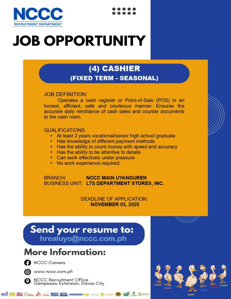 ๐ LTS Department Stores, Inc. is hiring (4) Cashiers for a Fixed-Term (Seasonal) position.